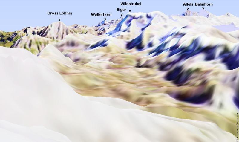 | 12 de 21. François devant l'Eiger, le Wildstrubel, l'Altels et le Balmhorn Voir le panorama de l'Atlas de la Suisse |
