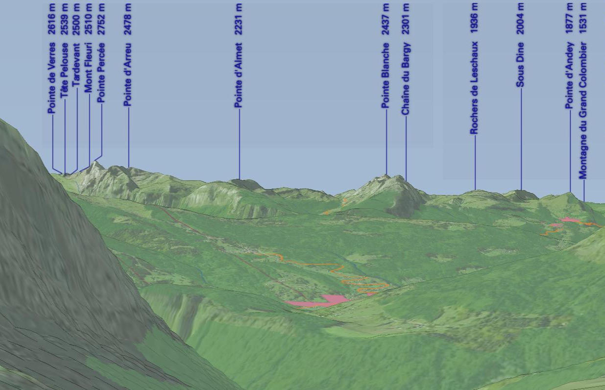 | 2 de 9. A droite de la pointe de Tuet la vue sur la pointe Percée, le Bargy et la Pointe d'Andey Afficher les noms des sommets |